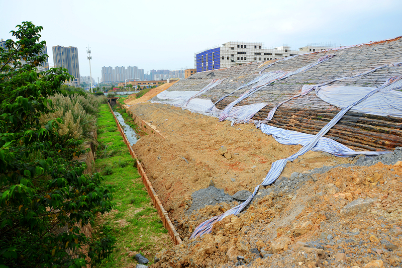 中恒边坡整治工程于2015年7月26日开始进场施工建设,合同工期为60天。该边坡治理工程长度为270米,项目总投资为275万元。主要以土工格栅为主体结构进行支护,对边坡及滑坡主体进行治理,辅助工程有:排水设置和清理坡面。主要工程量有:土方开挖运输7.5万立方,土方回填压实7万立方,填土土工格栅铺设12.6万平方米,压脚墙长度220米,整个项目边坡的填土高度平均为16米。
