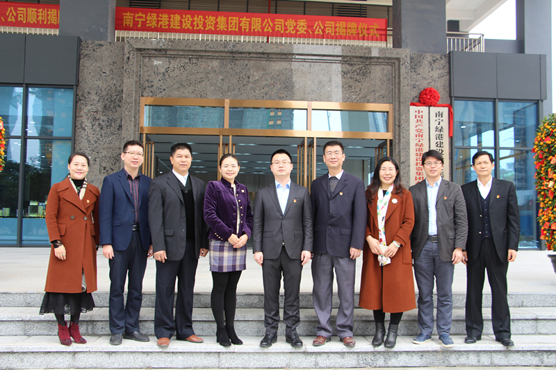 经开区党工委书记、管委会主任何尚汉,经开区党工委副书记覃传财,绿港集团党委书记、董事长、总经理龚国强,绿港集团副总经理陆羿冰共同为绿港集团党委、公司揭牌