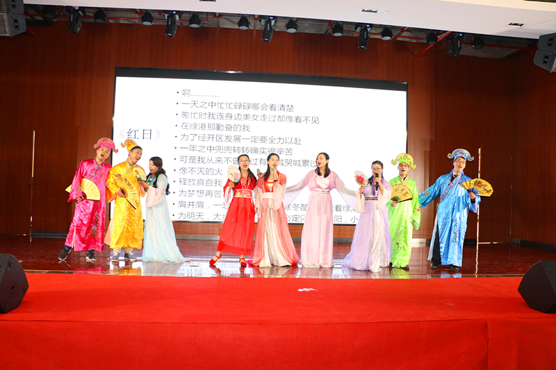 随后,来自集团工程管理部林重胤以及嘉通公司潘青青甜蜜献唱《告白气球》,让大家感受到了爱情的丝丝美好。嘉通公司的《夸夸咱公司》,用三句半的表演形式唱出了绿港集团浓浓的企业文化情愫,也展现了绿港员工积极、拼搏、向上的精神。《我要回绿港》、《声临其境》、《好运来》、《爱》、《好嗨哟》等多个节目在观众的热情掌声中联袂奉上一场精彩演出,整个活动歌声笑声、热烈的掌声汇成了欢乐的海洋。集团营销管理中心的《四小天王齐贺岁》以及集团计划运营部、纪检监察审计部、安全监督部联合带来的《蒙面唱将猜猜猜》将活动推向高潮,现场掌声不断。快板《绿港赞歌》道出了绿港集团成立五载,绿港人用智慧和汗水所取得的成效。最后,集团领导班子压轴出场,带来诗歌朗诵《相信未来》,赢得阵阵掌声,让大家坚定了信心、鼓足了干劲,对美好生活更加热爱和向往。