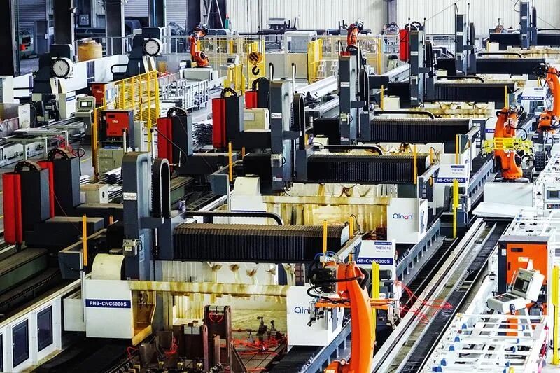 南南铝业的自动化加工中心内,机器人正在加工铝合金型材。 记者叶子榕摄