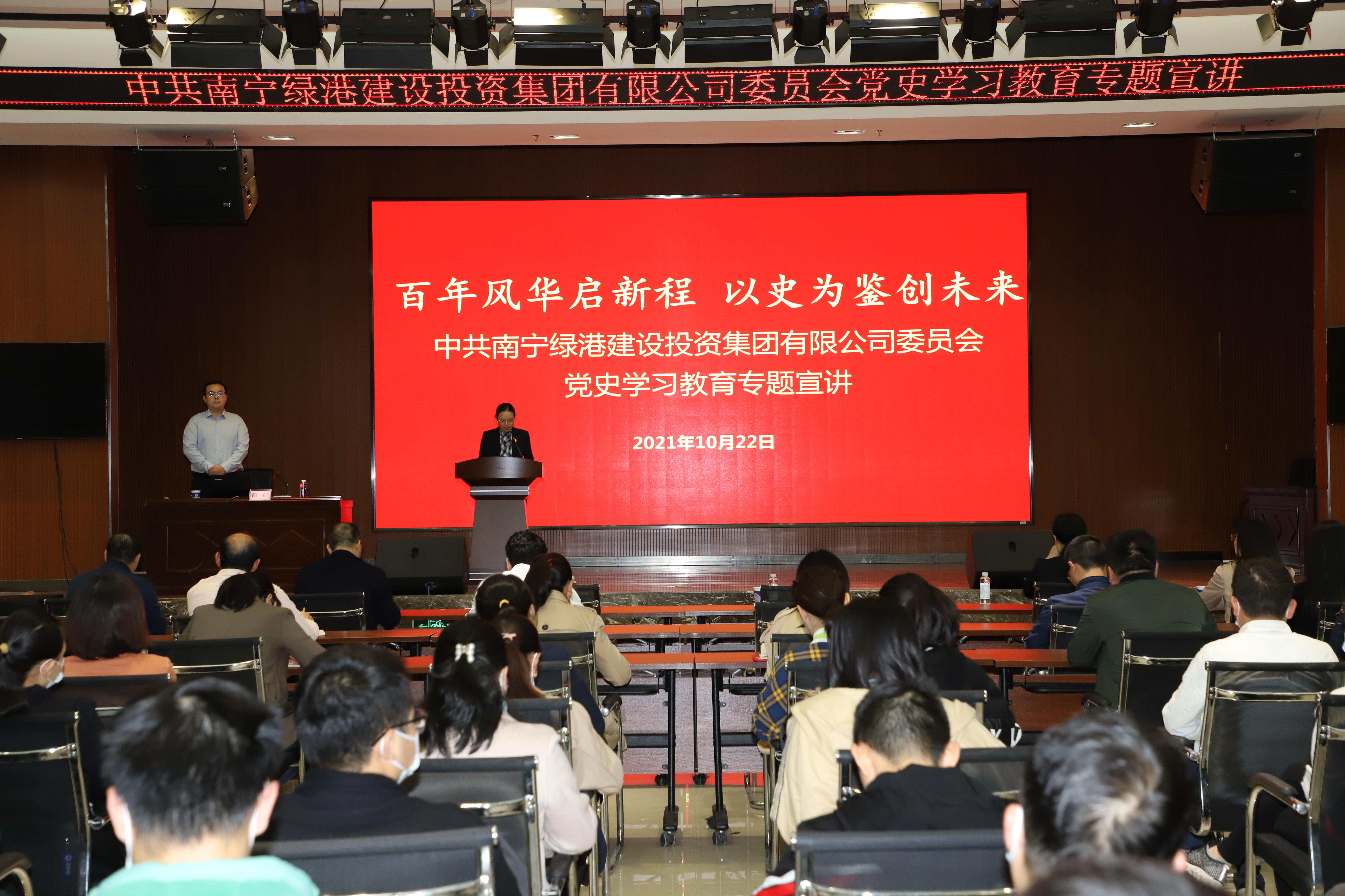 为持续推进党史学习教育走深走实,让广大党员干部更加深入理解习近平总书记在庆祝中国共产党成立100周年大会上的重要精神,10月22日,绿港集团党委举办学习贯彻习近平总书记“七一”重要讲话精神专题宣讲会。此宣讲会由集团党委委员、副总经理、工会主席陆羿冰主持。集团公司全体党员、预备党员、积极分子约150人参加宣讲会。