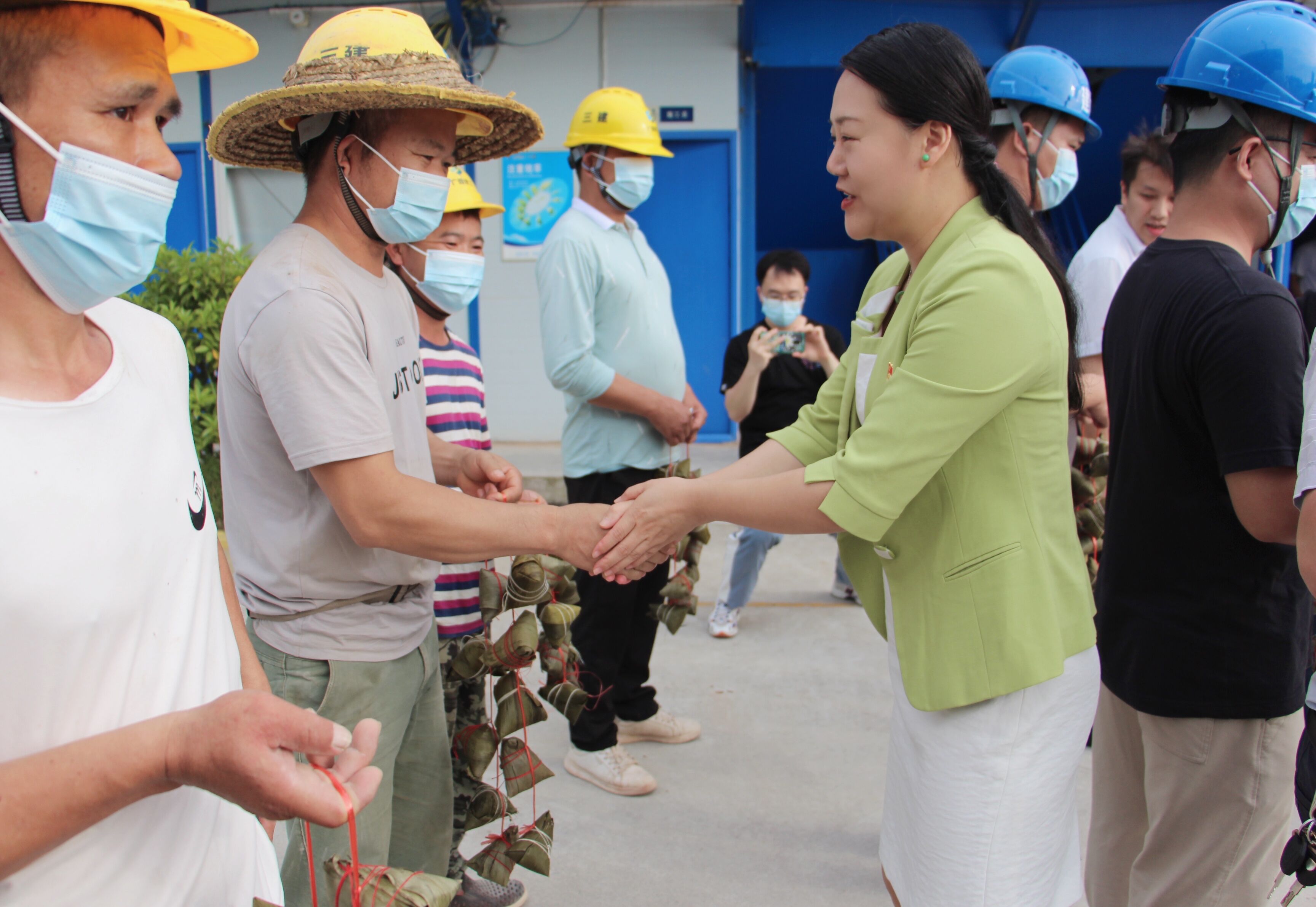 荷月繁花似锦来,粽米飘香温情至。端午佳节将至,为进一步传承中华民族传统文化,深入挖掘端午节的文化内涵,增强文化自信,弘扬新时代爱国主义精神,涵养广大党员的家国情怀,6月1日,嘉通公司党支部联合经开区建设发展局党支部、广西三建南分机关党支部深入绿港•金阳产业城项目开展2022年“端午粽飘香 浓浓家国情”主题党日活动,为项目一线工人送去粽子等慰问品以及节日问候。绿港集团党委委员、副总经理、嘉通党支部书记黄丽琴以及嘉通公司党支部全体党员参加活动。